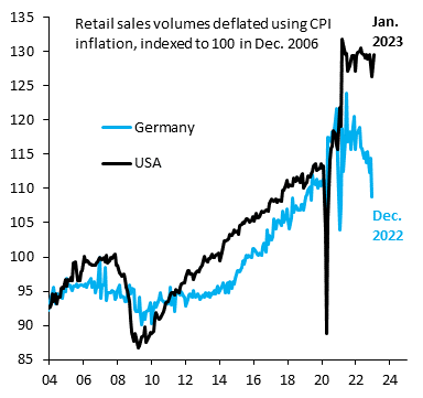 “The picture that's emerging from both sides of the Atlantic: a resilient US and slowing Europe. Real retail sales in the US (black) remain near their post-COVID highs, while retail sales volumes for Germany (blue) tanked towards the end of 2022. Euro will go back below parity…” by Robin Brooks, Chief Economist at IIF