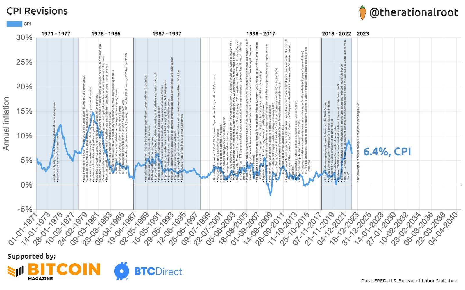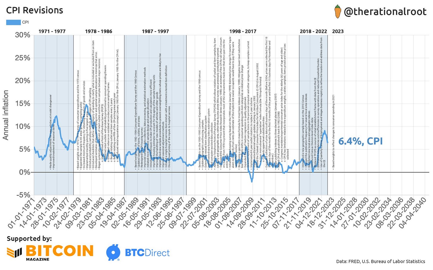 The new CPI print came in at 6.4%. The metric was changed (again) in Jan 2023 where weights were adjusted. Chart shows historic changes to CPI: